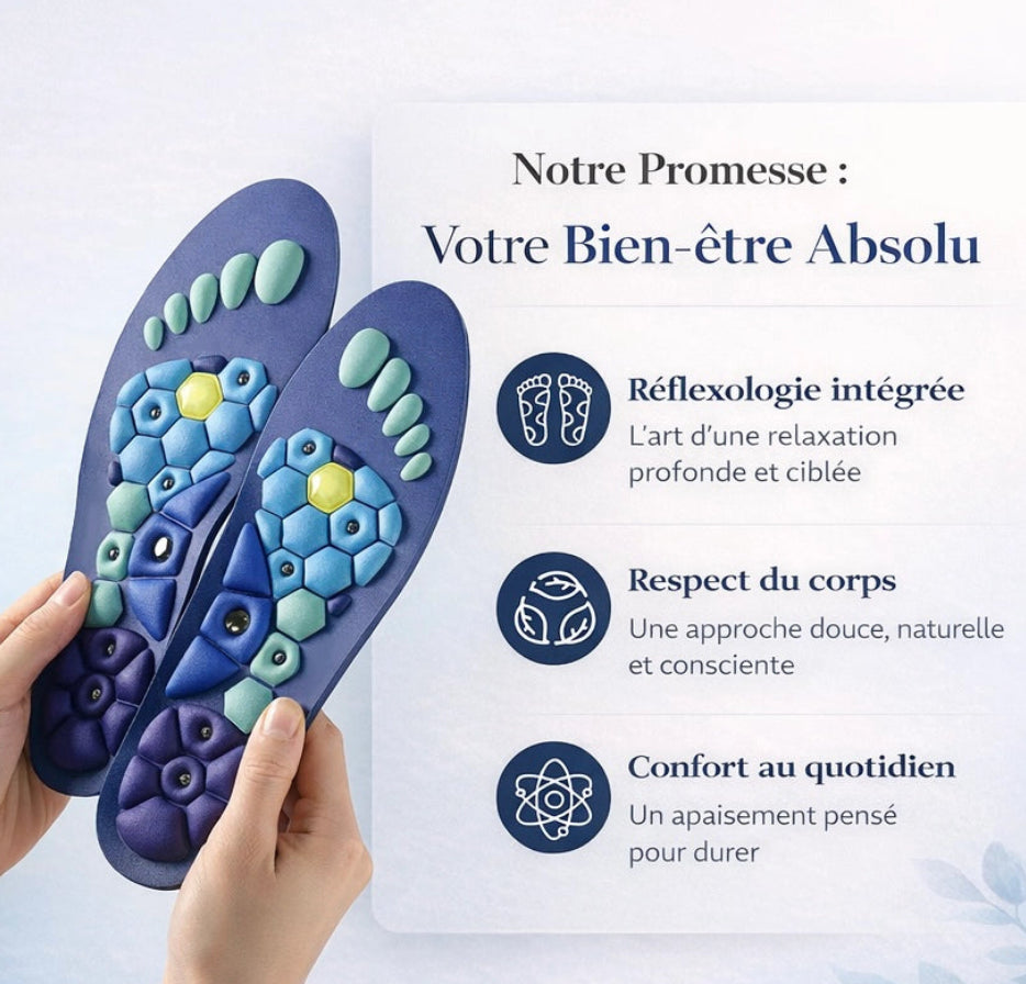 Nos semelles utilisent une technologie d’acupression ciblée pour stimuler les points réflexes sous la voûte plantaire. Conçues pour le confort au quotidien, elles favorisent une sensation de jambes plus légères et vous accompagnent plus longtemps, avec plus de plaisir.